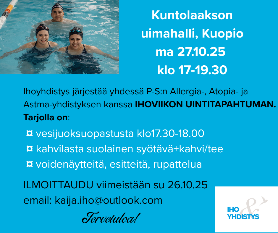 27.10.2025 klo 17.30 Turussa Lounatuulet talossa, Ihotalosta erikoislääkäri Laura Raikon luento. Yhteistyönä Lounais-Suomen allergia- ja astma yhdistyksen ja Ihoyhdistyksen sekä Atopiayhdistyksen kanssa järjestämä Ihoviikon tapahtuma.