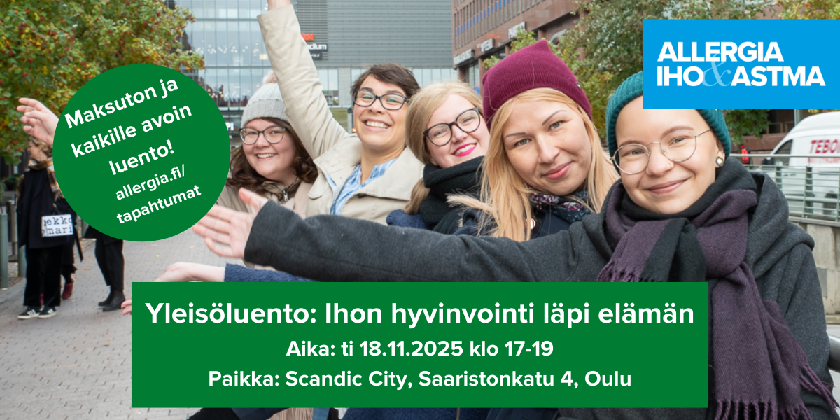 Paikan päälle voi tulla myös ilmoittautumatta. Tilaisuuden järjestävät yhteistyössä Allergia-, iho- ja astmaliitto, Ihoyhdistys, Oulun seudun Allergia-, atopia- ja astmayhdistys sekä Pohjois-Suomen Alopecia- ja vitiligoyhdistys
