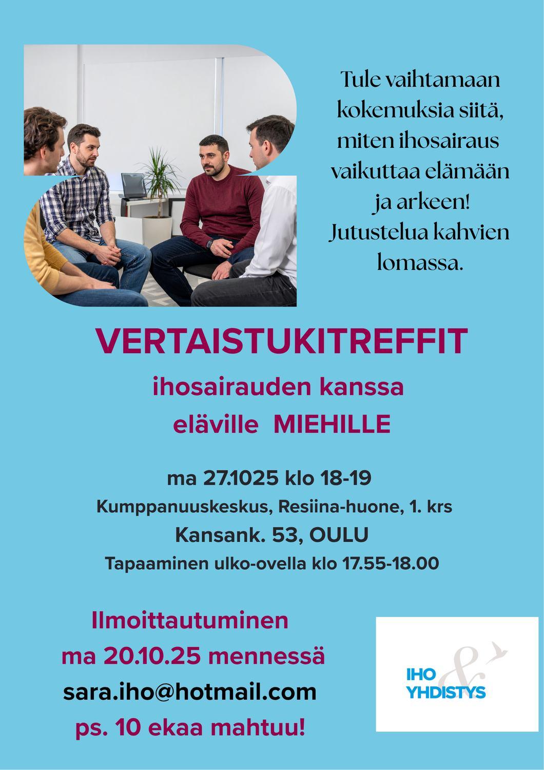 27.10.2025 Oulu miesten treffit klo 18.00-19.00, Kumppanuuskeskus, Resiina-huone, 1 kerros, Kansankatu 53 / Oulu, ilmoittautuminen ma 20.10. mennessä sara.iho@hotmail.com