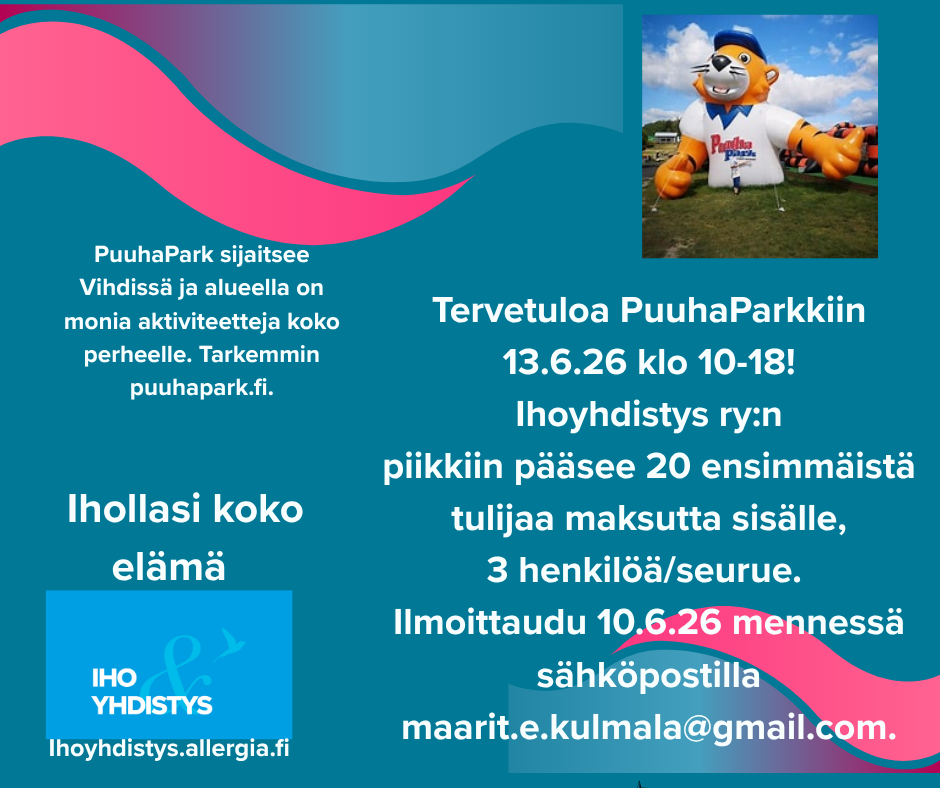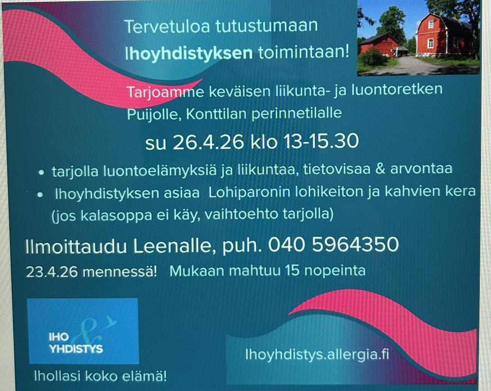 9.4.26 verkkotreffit jäkälää sairastaville, aiheena liikunta 11.4.26 Sievin Urjanlinnassa, Ihoyhdistys tarjoaa ilmaisen tanssikurssin 20 ensimmäiselle, tarkemmin ilmoituksessa sivun alaosassa. 13.4.26 Oulun, OYS A-talo, Olkapisteellä klo 9-11 14.4.26 Kokkolan Olka-pisteellä klo 10-12 26.4.26 Puijon Konttilassa keväinen liikunta- ja luontoretkitapahtuma 15 nopeimmalle, tarkemmat tiedot sivun alaosassa. 28.4.26 Yhdistyksen jäsenilta netissä klo 18.00, aiheena Luontoterveys. 13.6.26 Vihdin PuuhaParkissa koko perheen aktiivinen päivä, jonne yhdistyksemme piikkiin pääsee 20 ilmoittautunutta, 3 henkilöä/seurue. Tarkemmin sivun alaosassa, tutustu ja ilmoittaudu mukaan, tervetuloa!