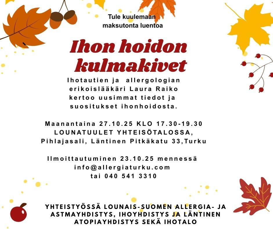 27.10.2025 klo 17.30 Turussa Lounatuulet talossa, Ihotalosta erikoislääkäri Laura Raikon luento. Yhteistyönä Lounais-Suomen allergia- ja astma yhdistyksen ja Ihoyhdistyksen sekä Atopiayhdistyksen kanssa järjestämä Ihoviikon tapahtuma.
