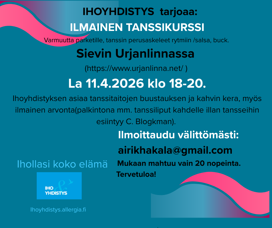 9.4.26 verkkotreffit jäkälää sairastaville, aiheena liikunta 11.4.26 Sievin Urjanlinnassa, Ihoyhdistys tarjoaa ilmaisen tanssikurssin 20 ensimmäiselle, tarkemmin ilmoituksessa sivun alaosassa.